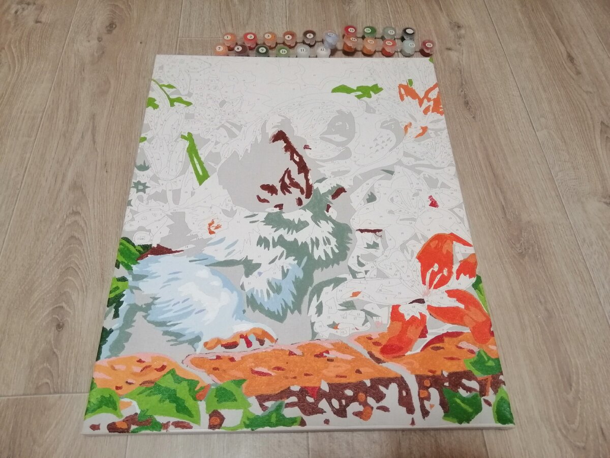 На первый взгляд рисунок показался мне простым (по сравнению с предыдущими моими картинами по номерам) именно по этому я доверила рисовать ребёнку. Тут не обошлось конечно без проблем, приходилось исправлять ошибки, перекрашивать некоторые элементы, ну и подкрашивать места, где краска легла с белыми вкраплениями... В общем-то можно сказать - рисовали вместе.