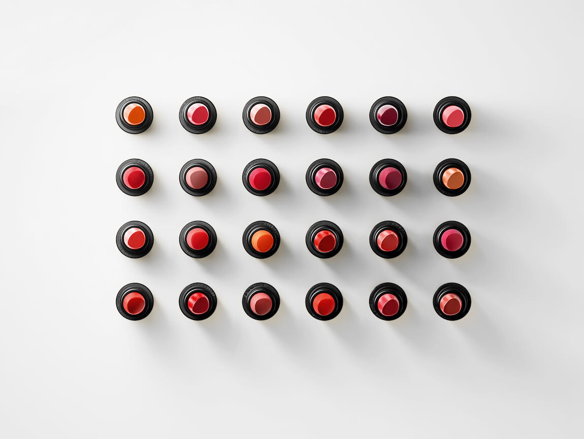 Первым продуктом, представленным широкой публике, стали роскошные помады – Rouge Hermes, 24 оттенка с матовым и атласным финишем, имитирующие текстуру и оттенки разных видов кожи Hermes. Это перекличка лаково-блестящих, матовых оттенков, матового золота – как признак богатства, но без выставления напоказ. Классические оранжевые коробочки, перевязанные черной брендированной лентой, скрывают яркий трёхцветный футляр с помадой.