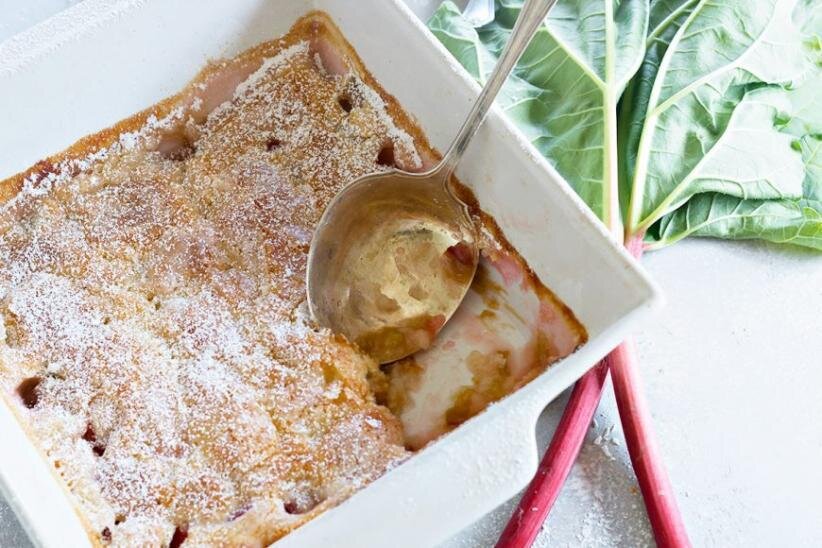 На дне теплый, мягкий и пикантный ревень, посыпанный легким пирогом с хрустящей карамелизованной сахарной начинкой.