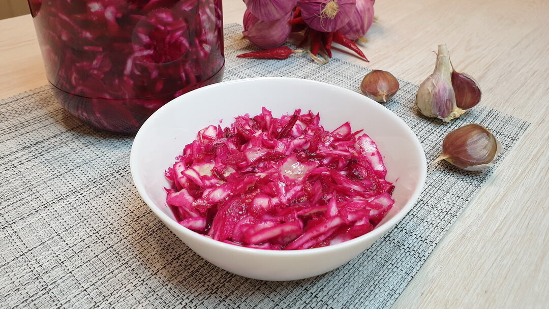 - Сегодня приготовим салат из капусты. А точнее это будет маринованная вкусная капуста со свеклой. Приготовление капусты не займёт у вас много времени и такая быстрая капуста сможет вас выручить, как заправка для борща. Капуста в банке, может храниться в холодильнике несколько дней и при этом останется вкусной. Капуста со свеклой, морковью и чесноком, это ещё и полезная закуска. Если вы любите рецепты из капусты, обязательно попробуйте этот салат.