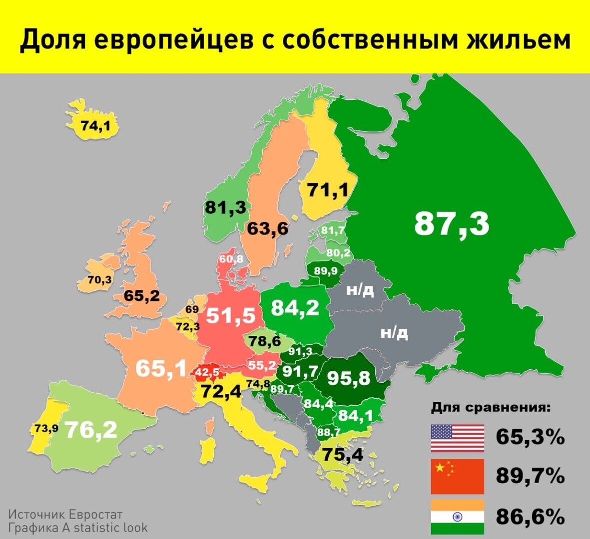 Если посмотреть на карту, то мы увидим, что у всех стран, входящих в СССР или в Организацию Варшавского Договора высокий уровень жителей с собственным жильём.