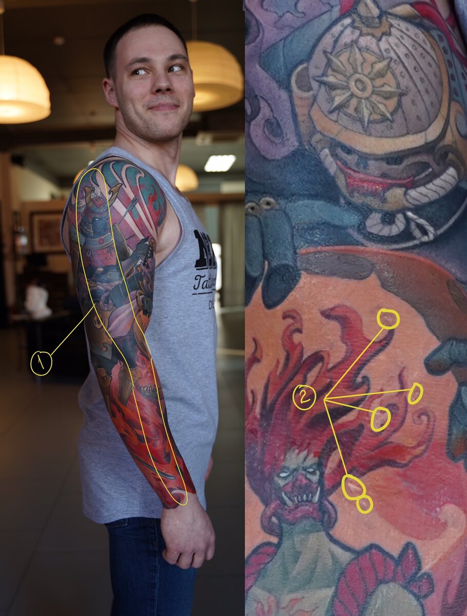 Самое главное - кожа. Если кожа влияет на восприятие рисунка, то это не ваша вина. Нет смысла оправдываться в описании к фотографии перед клиентами, проще исправить дефект. Например небольшие участки после коррекции (2) на моей работе, где я подкрасил маленькие недочеты той же самой краской что и вокруг. В свежем виде она выглядит более светлой и опухает из-за травмы. Вокруг появляется покраснение. Естественно через месяц эти участки будут идентичными окружающей коже, но фотография нужна сейчас. Просить клиента прилететь снова ради фотографии я не буду, а просить сфотографировать самому ни чем хорошим не кончается. Поэтому я убираю эти мелкие изъяны, чтобы не портить фотографию. Так же я могу чуть сгладить стык свежего и зажившего цвета чтобы не было видно резкой границы. Это делает картинку более приятной, но не обманывает зрителя, ведь я знаю что в жизни она так и будет выглядеть.