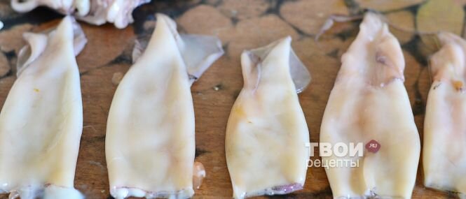 Мелких кальмаров выпотрошить и снять шкурку.
