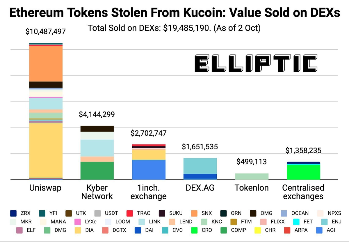 Тем не менее, по данным аналитиков из Elliptic, хакеры уже отмыли практически $19,5 млн в токенах формата ERC-20 на децентрализованных биржах (DEX), включая Uniswap, Kyber, 1inch и другие. DEX позволяют проводить свопы без прохождения процедуры KYC, которая является обязательной для подавляющего большинства централизованных бирж.