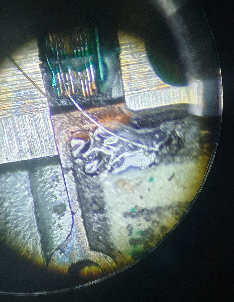 На фото под микроскопом процесс восстановления шлейфа кнопки HOME на Iphone 6s. Заменить ее можно только с потерей функции Touch ID (сканер отпечатков пальцев), но