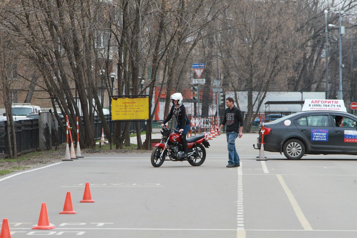 - ну и моё любимое: упражнение толкач (это 1.6). Двигатель не работает, передача нейтральная, инструктор, толкая мот с учеником в багажник, разбегается, и напоследок ещё доталкивает сколько может для максимального турбогипперускорения (да, труд инструктора, собака, тяжкий). Задача ученика зажать колени, смотреть строго вперёд на уровне глаз и подруливать столько, сколько сможет, пока мот движется накатом, вплоть до полной остановки. Часто это упражнение заставляет балансировать тех, кто в движении на холостых не держит равновесие никак.