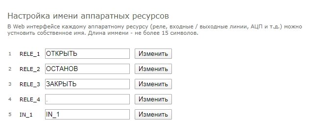 Для удобства переименуем эти кнопки в разделе Настройки (Главная Панель → Общие настройки). Для 4-го реле (которое не используется) установим имя в виде "точки", чтобы "не смущать" оператора.