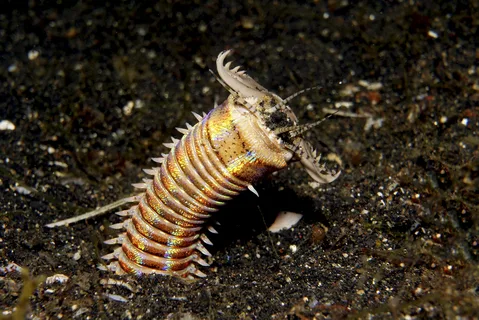 Этот ненасытный хищник трёх метров длинной охотится на добычу самым дьявольским способом, зарывается в землю и высовывая наружу только часть своего тела поджидает жертву.Только рыба проплывает мимо он тут-же бросается на нее с огромной скоростью и утягивает под землю.У него нет мозга и глаз,но зато есть усики которые оснащены очень чувствительными рецепторами улавливающие даже малейшие изменения освещенности,что говорит червю о приближении добычи.