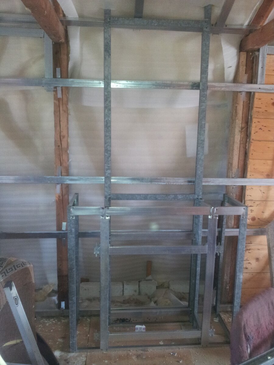 Имеете ли вы строительные навыки или нет, моя инструкция будет хорошим началом и шансом попробовать себя в этом мастерстве. У меня этот камин на даче простоял до самого пожара, но пожар, произошел не по этой причине, да и вернемся к основной теме. Камин из гипсокартона действительно сделать легко и просто. Достаточно приготовить: И теперь немного терпения и ловкости. Именно этот камин я делал впервые, но он с практичной точки зрения был вполне употребим, потому следуйте за мной. Первым шагом будет создание каркаса из металлопрофиля, еще когда я делал этот камин, я не представлял, что он бывает разных назначений и размеров, у меня был один (крепкий) он и пошел в ход. Каркас, который на фото выше и был обшит гипсокартоном, да сейчас бы я сказал, что так делать нельзя. Однако практика показала, что усилив гипсокартон еще клеем и плиткой, и ктакой декоративный камин вполне имеет право на жизнь. Правда потом произошел перерыв и к камину я вернулся чуть позже, но отмечу, что в камине уже б