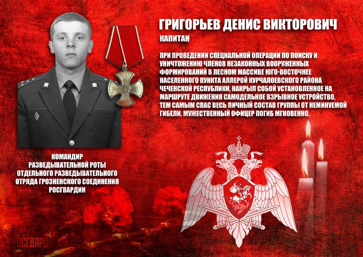 Командир разведывательной роты отдельного разведывательного отряда внутренних войск МВД России капитан Денис Григорьев навечно зачислен в списки личного состава отдельной ордена Жукова бригады оперативного назначения Северо-Кавказского округа войск национальной гвардии РФ.