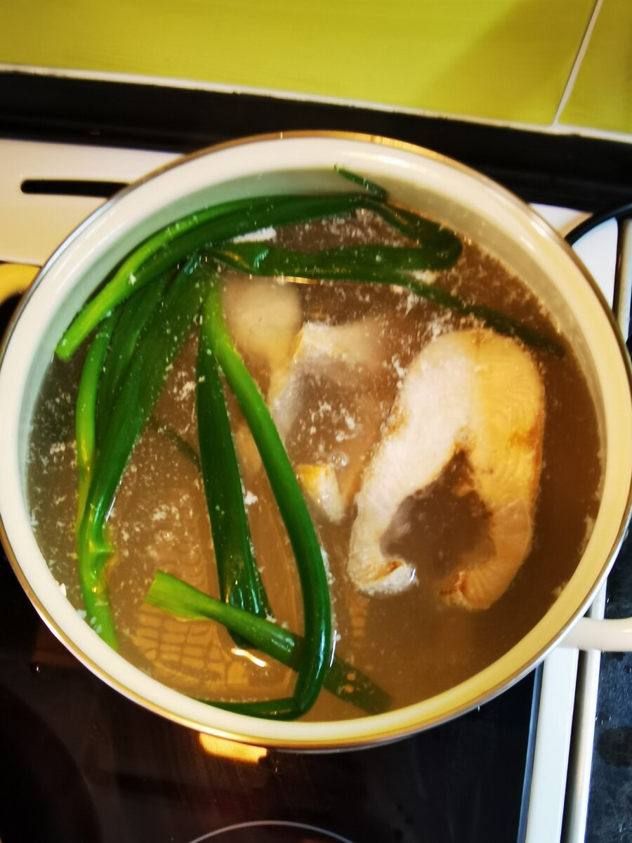 Для начала я промыла куски рыбы и кинула их кастрюлю (4 л.) с закипающей водой. После закипания, кинула в кастрюлю стебли зелёного лука для аромата.