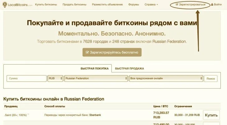 Переходим по ссылке https://localbitcoins.fi/ (именно на это зеркало сайта, .com в России и большинстве стран СНГ не работает. Домен в зоне .net также не работает, домен в зоне .fi является официальным зеркалом localbitcoins)