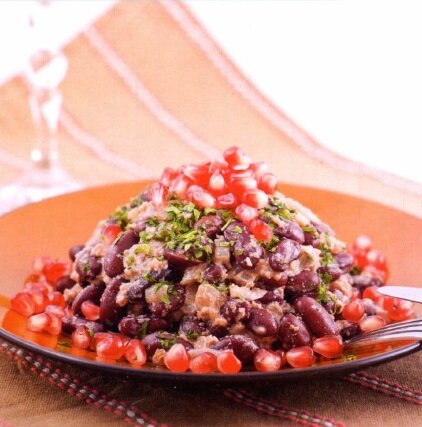4. Добавляем ореховый соус к фасоли, перемешиваем. Обязательно даем настояться несколько часов. Перед украшаем зёрнами граната.