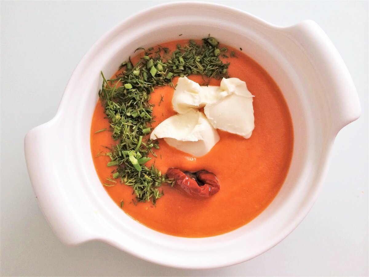 Разлила по тарелкам, добавила ложку мягкого сыра , вяленый помидор и зелень. Вкусно и красиво.