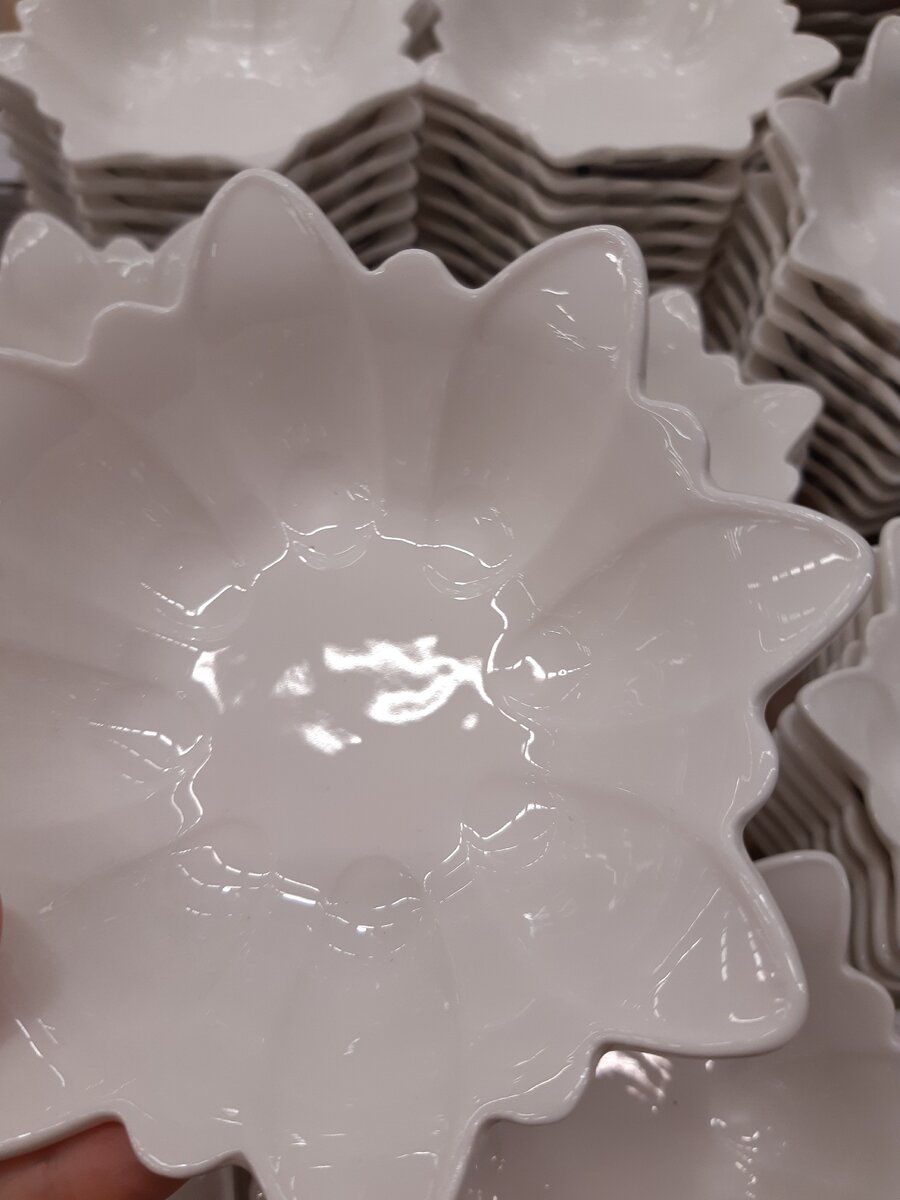 Такое вот фигурное блюдо из фарфора белого цвета. Стоит сейчас по скидке всего лишь 99 рублей за одну штуку! Такие цены за фарфор, это же просто шок! Даже в Fix Price не вся посуда такая дешевая!) Чтобы вы примерно представляли, то размером это блюдо примерно с середину ладони, небольшое. И ничего, что блюдо такого размера, главное в нем необычная форма, напоминающая какой-то цветок. Можно, например, купить три таких штуки, деревянную досочку и у вас получится импровизированая менажница на новогодний стол.