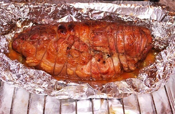 6. Поставить рулет в разогретую духовку на 2 часа. Проткнуть мясо тонким ножом до середины. Если на поверхности появится прозрачный сок без крови - рулет готов. На этом этапе рулет должен лежать на фольге шкуркой вниз, иначе в дальнейшем она станет жесткой.