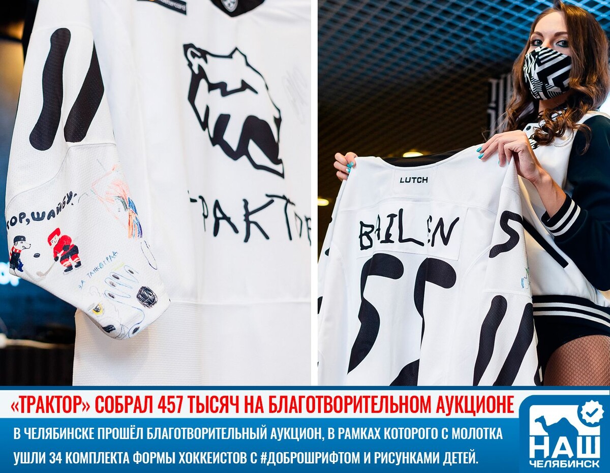 В Челябинске после матча «Трактор» – «Куньлунь Ред Стар» в фойе Ледовой арены прошёл благотворительный аукцион, в рамках которого с молотка ушли 34 комплекта формы хоккеистов с нанесёнными номерами и фамилиями #Доброшрифтом, а также рисунками детей. Именно в этой одежде спортсмены обыграли китайский коллектив.