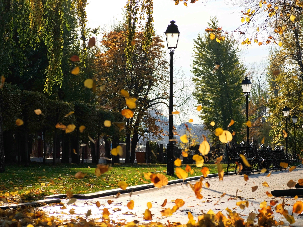 Аллея от памятника влюбленным до белой эстрады. Здесь стоят кованные лавки, которые прекрасно подходят для осенних фотосессий, вокруг них лежат опавшие красные, зеленые и желтые листья клена.