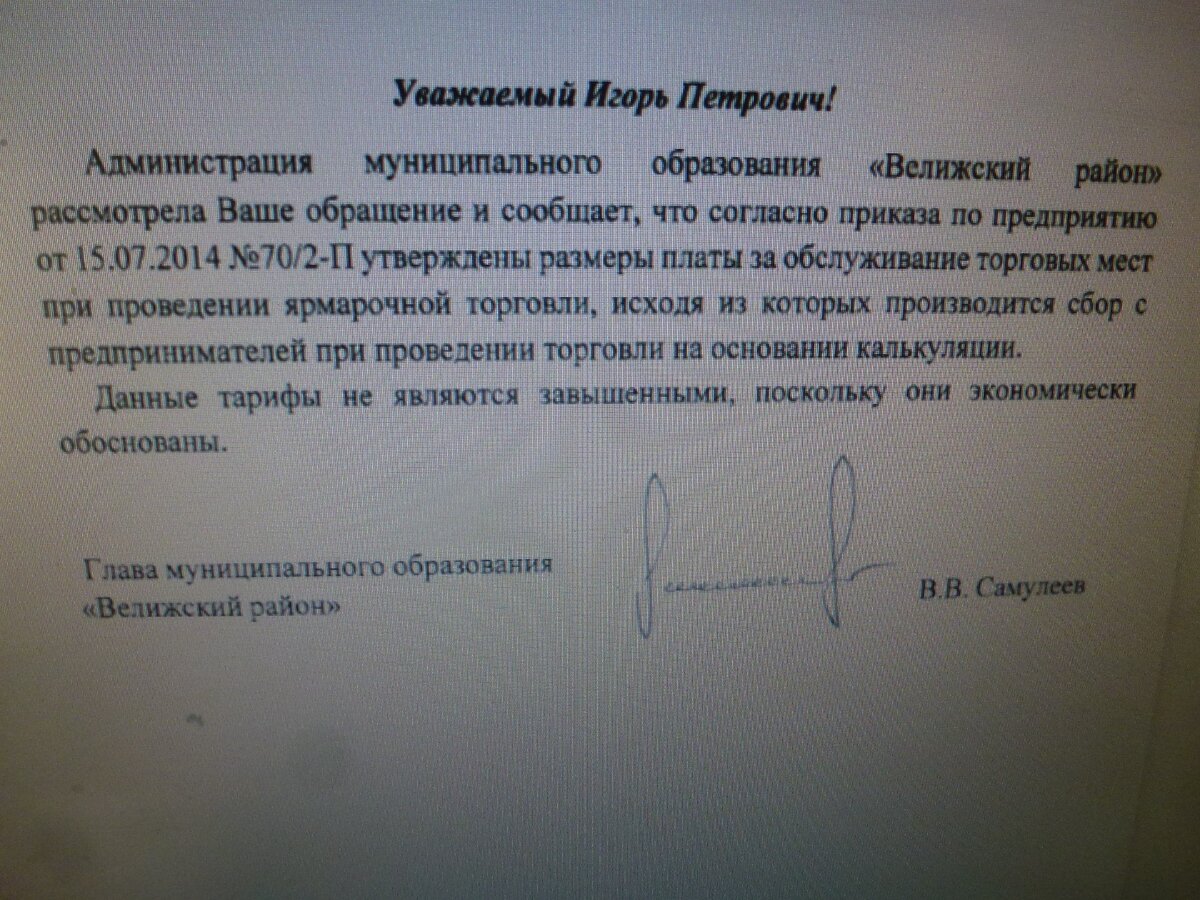 Администрация Велижского района Смоленской области поддерживает открытый грабёж предпринимателей ! За уборку торгового места нужно заплатить 150-300 рублей .