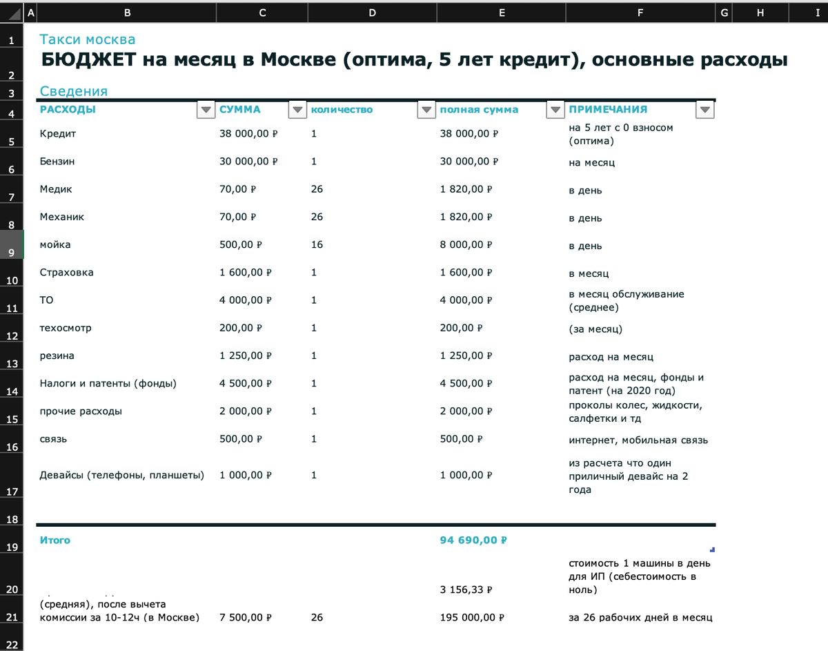 Я обещался товарищам сделать расчет расходов ИП в такси, в Мсокве. Вот выкладываю. Рассматриваем тариф к+ Киа Оптима.