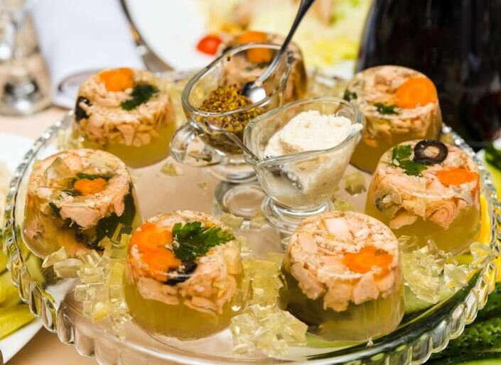 Поэтому для него выбирают деликатесные виды рыбы, мясное филе и языки. Его всегда красиво оформляют и подают как фирменное блюдо хозяйки ужина или повара ресторана.