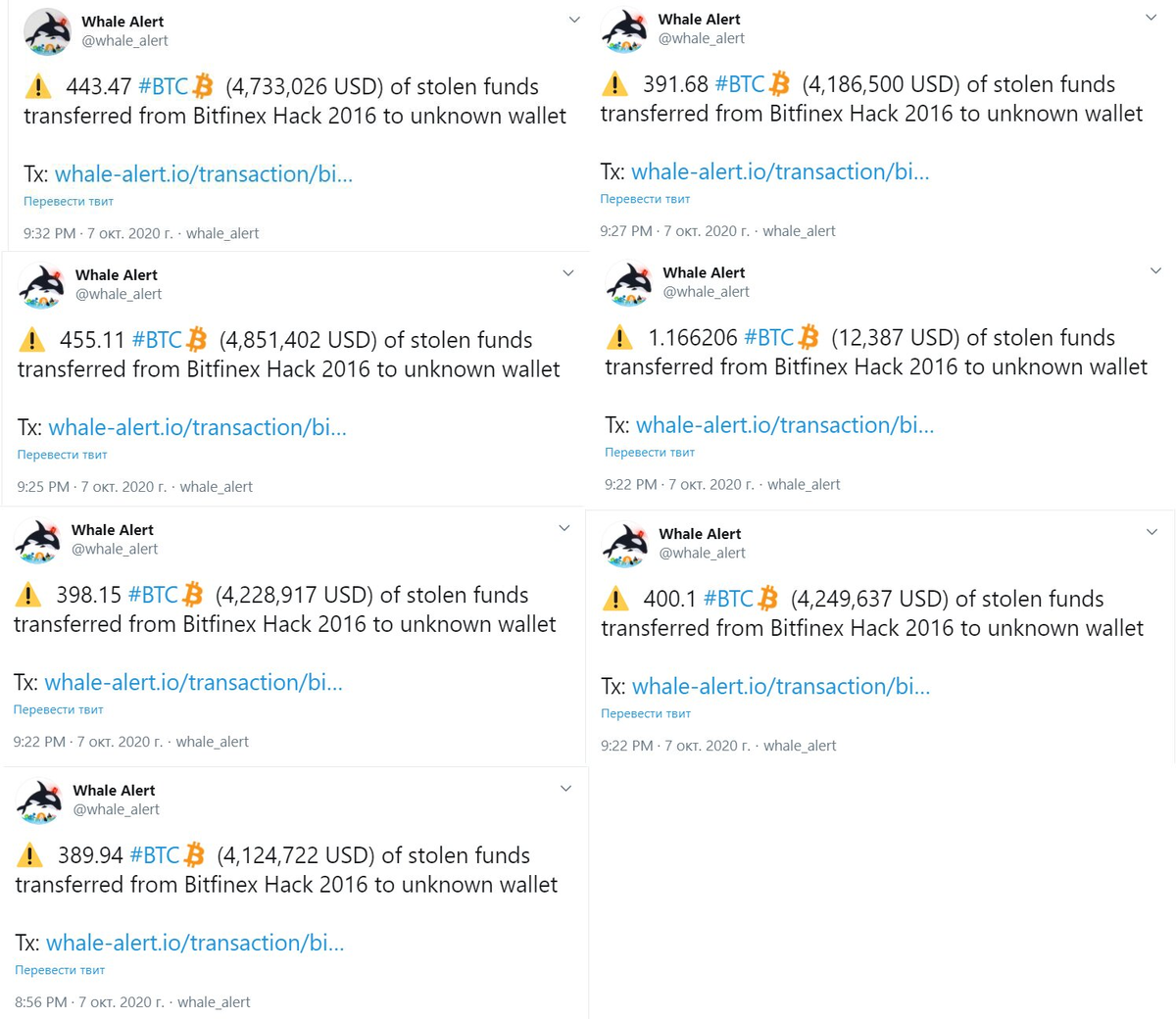 Украденные в 2016 году с популярной биржи цифровых активов Bitfinex средства вновь пришли в движение. На этот раз хакеры переместили около 2480 bitcoin на сумму свыше $26 млн. Информация об этом появилась в Twitter-боте Whale Alert.