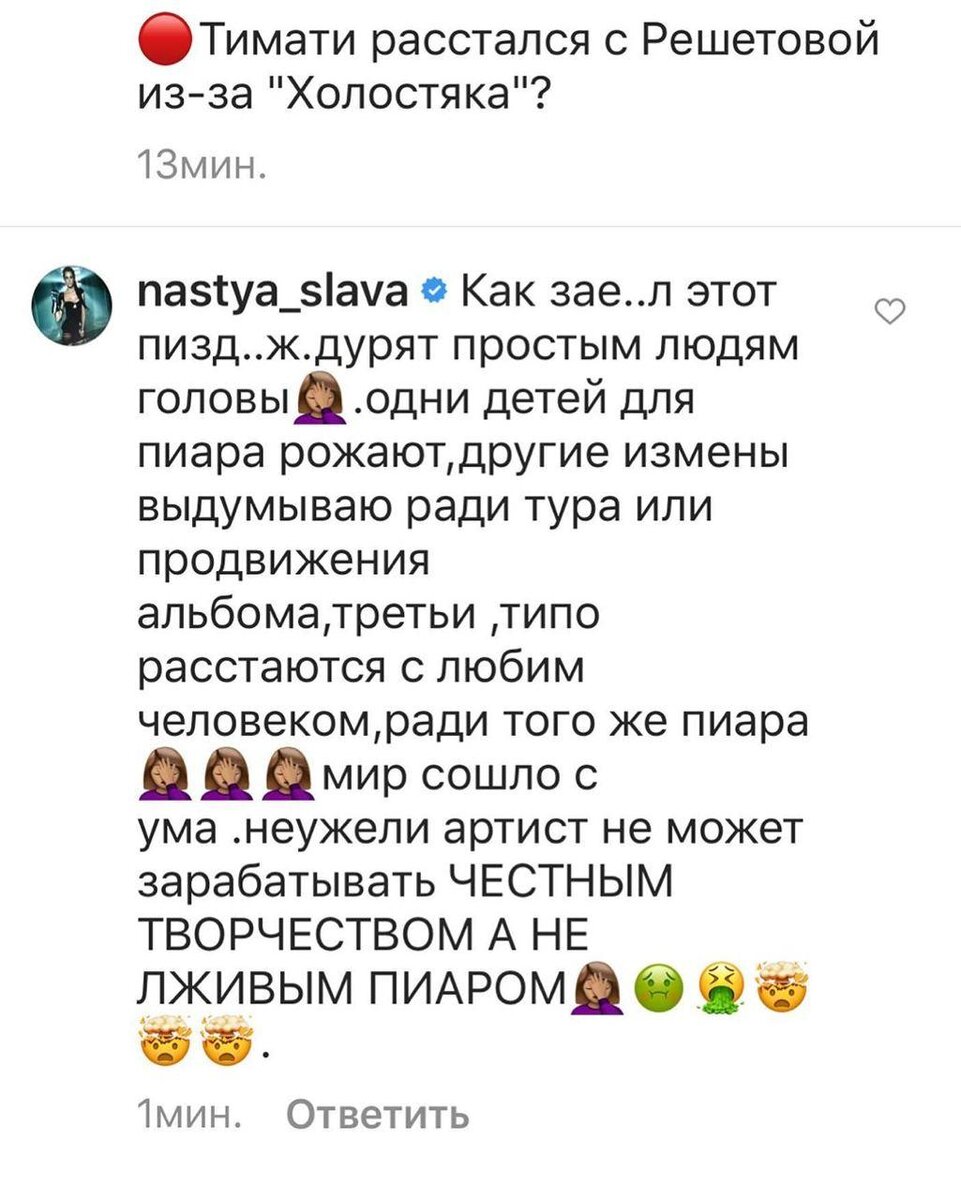 Ответ на вопрос: "Тимати расстался с Решетовой из-за Холостяка?" (именно Тимати будет следующим женихом в новом сезоне Холостяка) - поверг в шок поклонников звезды из-за огромного количества нецензурной лексики!