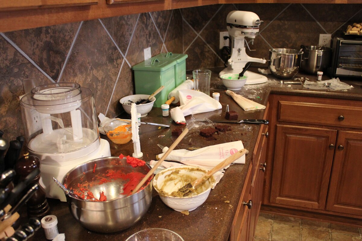 каждая рабочая поверхность и обеденный стол были грязными. Крошки, мука, рассыпанный сахар, грязные миски от теста, невымытая посуда, противни....