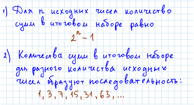 Для решения задачи полезно понимать - сколько сумм содержит итоговый набор для разного количества исходных чисел. Подробные рассуждения приведены здесь. Результаты: