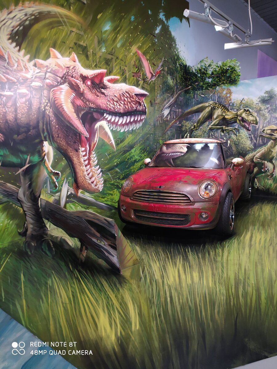 Первое что встречаем - современность в мире динозавров, можно сфоткаться так, как будто ты находишься в машине, а мимо пробегают динозавры.