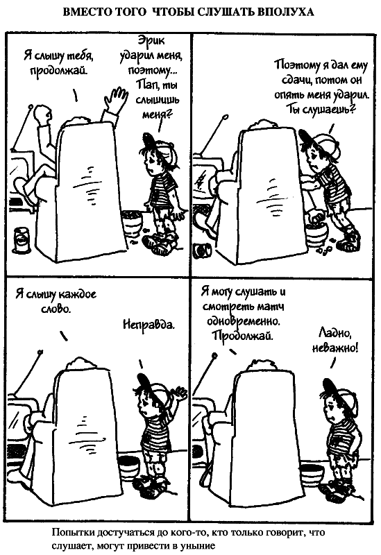 Отец был изумлен. Он не задавал вопросов, и все равно ребенок рассказал ему всю историю. Он не давал советов, и тем не менее ребенок придумал свое собственное решение. Ему показалось невероятным, что он так помог сыну, просто выслушав его и признав его чувства.