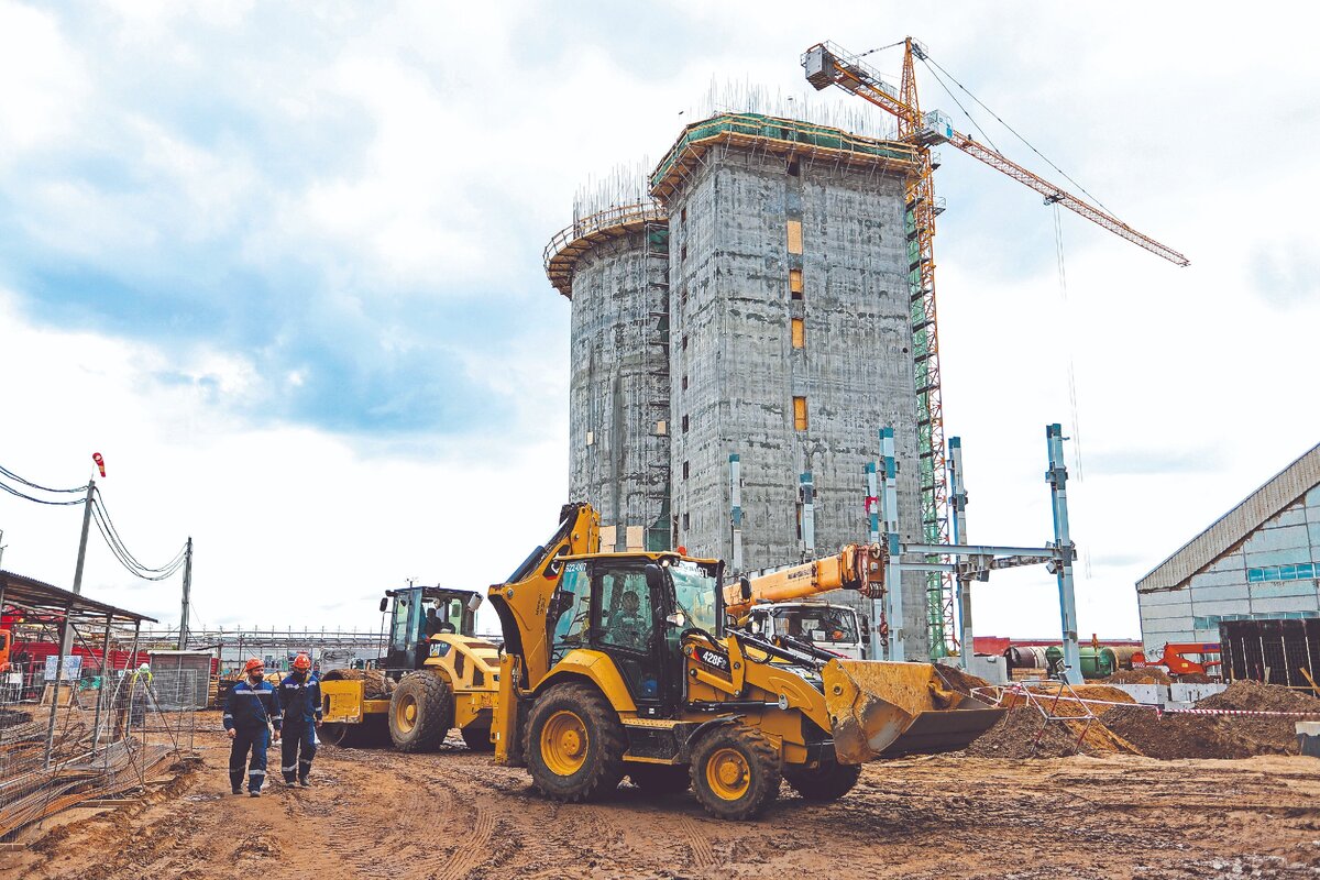 Рядом уже проявляются первые «кубики» металлоконструкций. Это будущий блок синтеза. Рядом бульдозер разравнивают площадку.