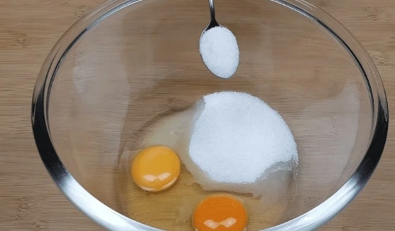 В миску разбиваем 2 яйца и добавляем 1/2стакана сахара