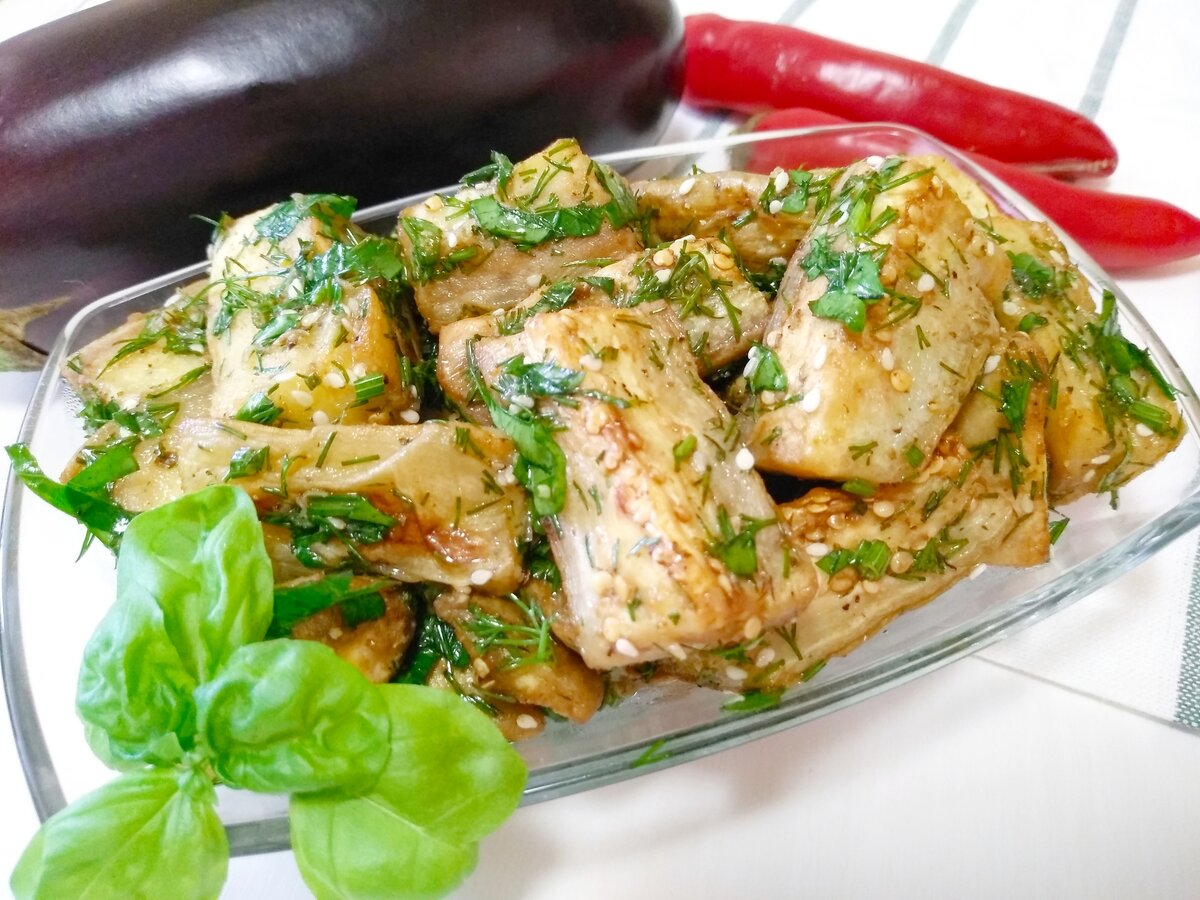 Достаем из духовки приготовленные баклажаны и горячими перекладываем в миску с заправкой, всё хорошенько перемешиваем чтобы баклажаны впитали в себя все ароматы заправки. Такая закуска хороша как в тёплом так и холодном виде. Просто и очень вкусно! Приготовьте, попробуйте!