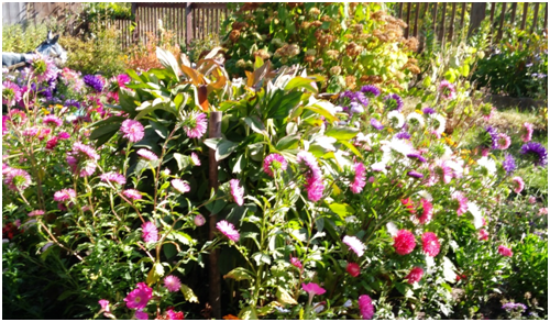 Загляделась на клумбу с цветами. Разноцветный хоровод астр вокруг куста пиона.