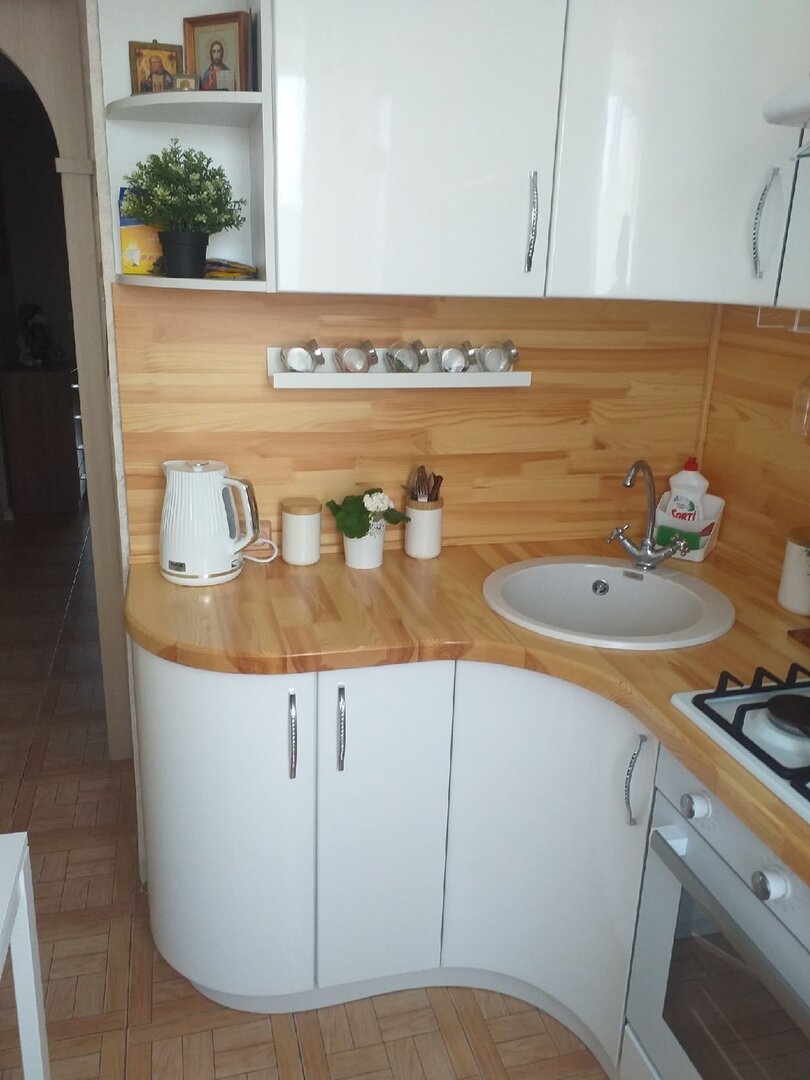 Приветствую вас, дорогие друзья! Удобная маленькая кухня - такое словосочетание кажется сомнительным и часто вызывает улыбку снисхождения. Но всё же это возможно. Нашла на просторах интернета фото этой кухни, о которой хозяйка отзывалась так: - Сначала я боялась делать такой дизайн. Вс же белая кухня это как-то не практично. Но сейчас я очень довольна тем, что получилось в итоге. И гости, когда приходят ко мне, всегда делают комплименты моей кухне." И ведь действительно многие люди опасаются делать свои кухни белыми, т.к. в голове сразу ассоциация с тем, что белый - маркий цвет. Но в кухнях намного неудобнее как раз тёмные цвета, потому что разводы и капли на тёмных поверхностях видно намного сильнее. Сама кухня сделана симпатично и интересно. Белые фасады в сочетании с деревянной столешницей и фартуком - вариант беспроигрышный. Смотрится свежо, стильно и просторно, даже на маленькой площади. Конечно, закруглённый угол сейчас делают редко, считая это немодным, но с точ