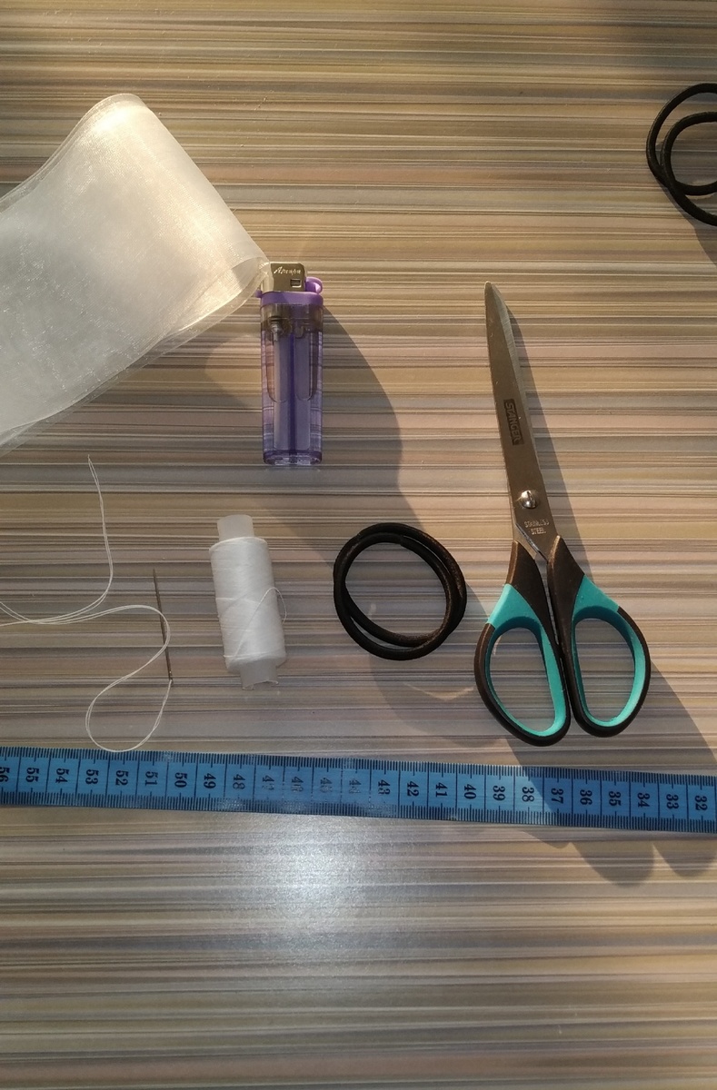 Сегодня я покажу как делать пышный и красивый бантик за 5 минут из капроновой ленты. Для этого нам понадобится: Все готово, можно приступать к работе. Берём сантиметр и выкладываем его так, чтобы можно было отмерить длину ленты. Отменяем 2,5 метра. Далее, обжигаем кончики ленты, чтобы при носке бантик не разошелся. После этого гармошкой сливаем ленточку по всей длине. Когда все сшили, формируем бантик. У меня он уже сам закручивался в нужную форму. Дело остаётся за малым. Пришивания резинку и наш бантик готов! Вот такая красота у нас получилась. Согласитесь быстро и довольно просто. Спасибо за просмотр!