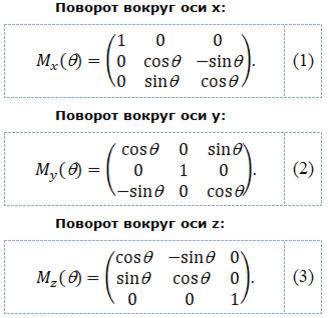 Матрицами поворота вокруг оси декартовой системы координат на угол θ вокруг осей x – в плоскости (yz), y – в плоскости (zx), и z– в плоскости (xy), в трёхмерном пространстве являются: