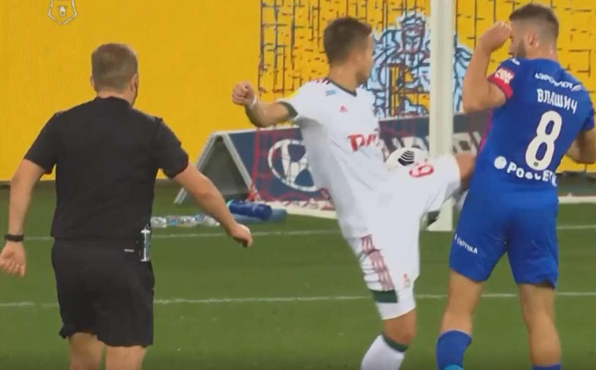 Вот первый кадр, на нём видно как игрок Локомотива - Куликов, пытается сыграть в мяч коленом, но совершает ошибку и мяч проскальзывает по нему. В данный момент рука игрока обороняющейся команды находится в естественном положение.