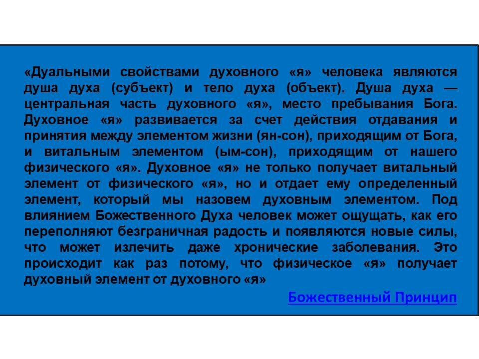 Дуальными свойствами духовного «я» человека являются душа духа (субъект) и тело духа (объект). Душа духа — центральная часть духовного «я», место пребывания Бога. Духовное «я» развивается за счет действия отдавания и принятия между элементом жизни (ян-сон), приходящим от Бога, и витальным элементом (ым-сон), приходящим от нашего физического «я». Духовное «я» не только получает витальный элемент