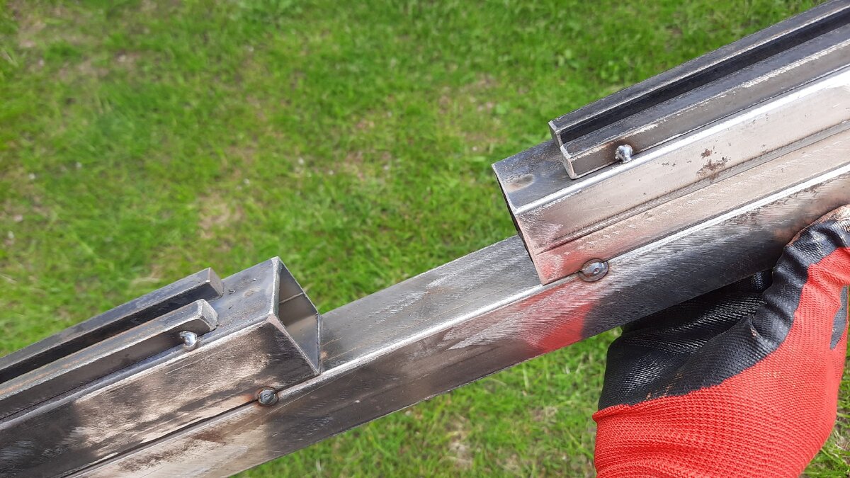 Затем берём длинный отрезок квадрата 10/10 для проверки соосность нашей приспособки. И прихватываем наши отрезки квадрата с двух сторон от оси. Края обрезков до шишки желательно так же не должны касаться. Расстояние около 1см.