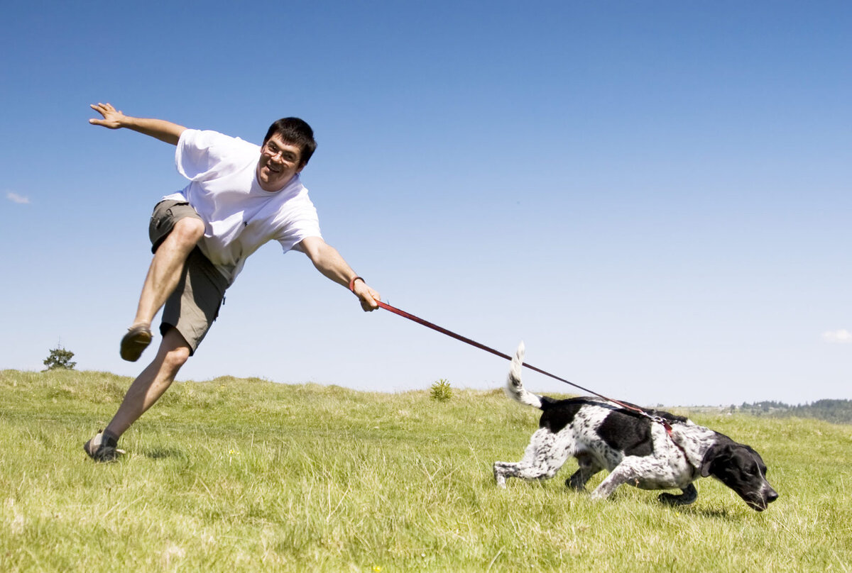 Научите собаку правильно ходить на поводке. Возьмите еду, создайте мотивацию, пусть собака поголодает полдня, день. Научитесь поощрять собаку, когда она идёт правильно. У собаки самый главный закон: «Если мне выгодно что-то делать — я это буду делать!». Делайте выгодным хождение возле вашей левой ноги, и следить за тем, куда вы идете и с какой скоростью. Для этого мы используем команды «Быстрее! Тише! Сюда!».