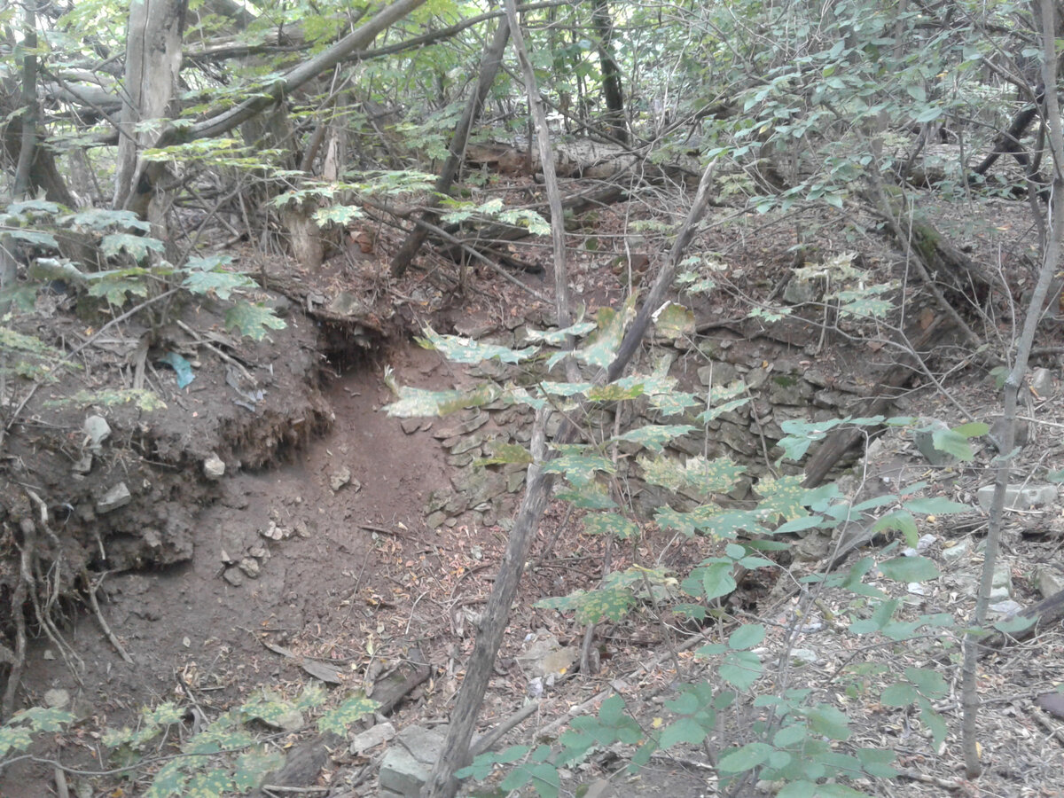 Итак, заходим в лесистую местность и видим первые признаки былой цивилизации. Когда-то здесь был погреб, сделан он был из природного камня.