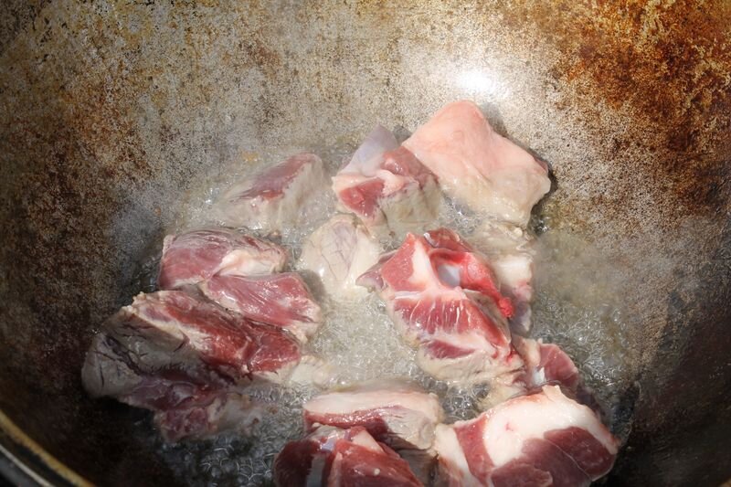 В казан льем масло, когда оно раскалилось до появления легкого дымка закладываем мясо. Вот люблю я вначале мясо, а потом лук, а не наоборот! Мне нравится красивый цвет и корочка у подрумяненного мяса, если вначале положить лук совершенно не по-моему все это будет выглядеть, да и вкус другой будет. Наверное. В общем мне нравится вначале мясо, но вы можете закладывать и лук, не вижу препятствий.