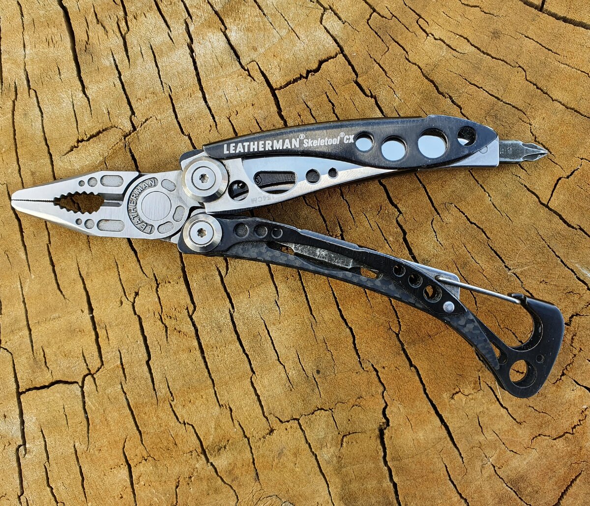 Почему нож называется SKELETOOL я надеюсь понятно, потому что у ножа отсутствуют какие либо накладки, а на виду только один каркас который как бы и является скелетом. Мультитул достаточно компактный, но и в жертву его компактности и красоте был принесён функционал, инструментов тут немного. Но надо сказать все те которыми я часто пользуюсь тут есть. Мы имеем следующий набор инструментов нож, пассатижи-кусачки, держатель для бит, открывашку-карабин.