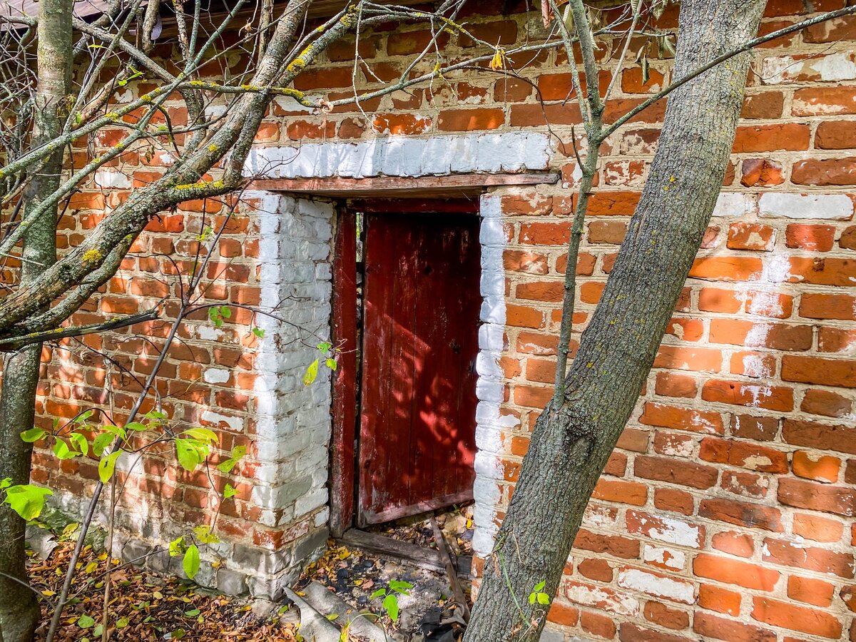 На полу этого сарая лежала какая-то деревянная дверь. Так я и не понял, откуда она. Входная-то дверь в это помещение вроде была на месте. А эту, видимо, кто-то потом сюда принёс, когда здание уже было заброшено.