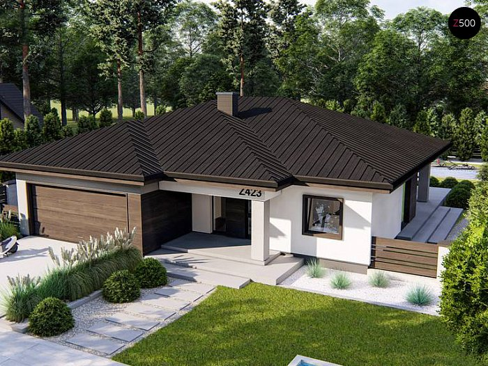 Z423 представляет собой современный одноэтажный дом с многоскатной крышей и гаражом на две машины.