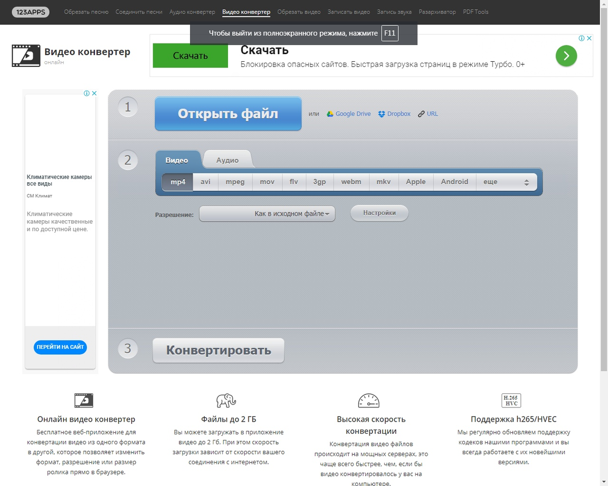 Работает очень просто - открываете файл, выбираете разрешение и формат, а затем, жмете - конвертировать. Скорость обработки зависит от вашего интернета, файла и мощности устройства. Так что, по этому поводу, сложно сказать точно.