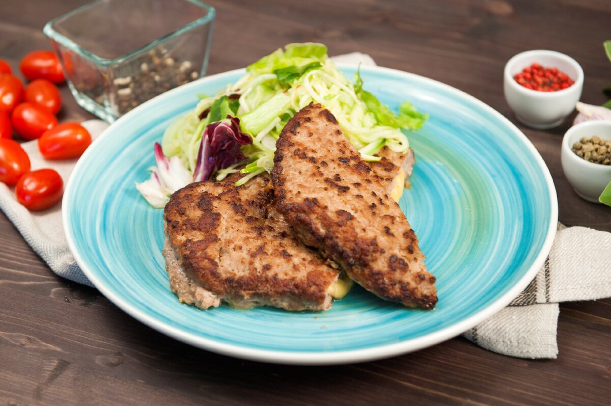 3. На разогретую сковороду с растительным маслом выкладываем мясной полуфабрикат. Затем переворачиваем и обжариваем с другой стороны, накрыв крышкой.