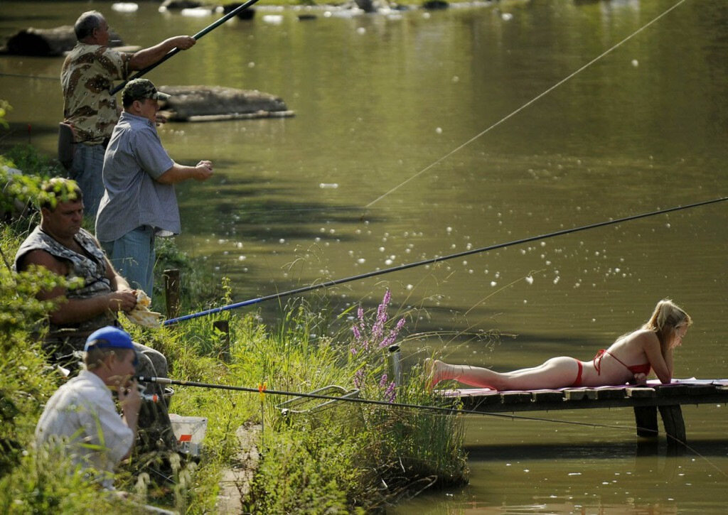 Мужик разобрал снасти, закинул удочку, ждёт поклевки.